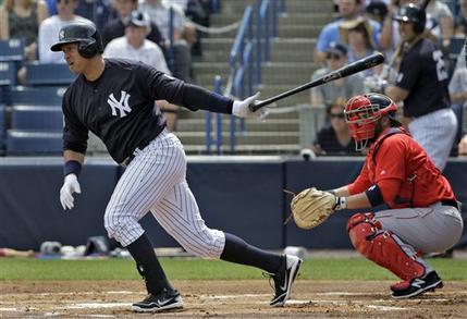 Alex Rodríguez bateó un par de sencillos, mientras que Jacoby Ellsbury conectó un triple en su estreno de pretemporada para que los Yanquis de Nueva York derrotasen el sábado 6-4 a los Medias Rojas de Boston en la Liga de la Toronja.