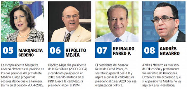 El estudio lo encabeza el presidente Danilo Medina, luego Luis Abinader, Leonel Fernández, David Collado, Margarita Cedeño, Hipólito Mejía, Reinaldo Pared Pérez, Andrés Navarro y Gonzálo Castillo.