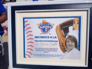 San Juan.- La Liga Deportiva Alex Reyes dedicó la octava edición del Clásico de Béisbol Infantil Jinova 2025 a la gobernadora de la provincia San Juan, doctora Ana María Castillo, en reconocimiento a sus aportes al desarrollo deportivo y cultural de la comunidad de Jinova.
