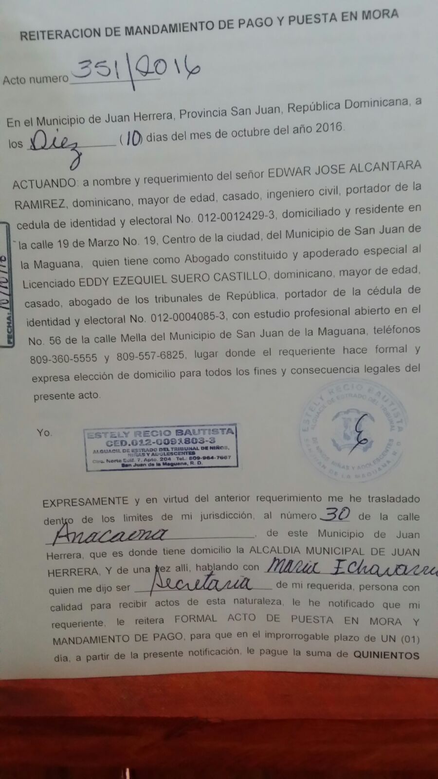 EN SAN JUAN.- Fue demandado el ayuntamiento del Municipio de Juan de Herrera por una deuda de RD$595,868.87 que se le debe al ingeniero Edwar Alcántara por la Construcción del cuartel de este municipio el cual fue construido hace ya mas de dos años.