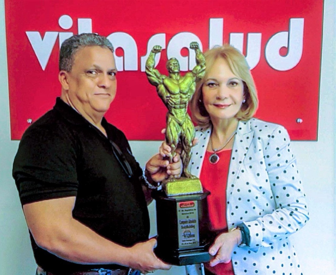 Así lo dio a conocer el señor Tony Peña R., presidente de FDFF, junto a la señora Clara Cabrera, principal ejecutiva de Vitasalud, patrocinador oficial de la justa atlética, belleza y excelencia en la simetría del cuerpo humano, quien entregó el valioso trofeo al famoso dirigente deportivo.