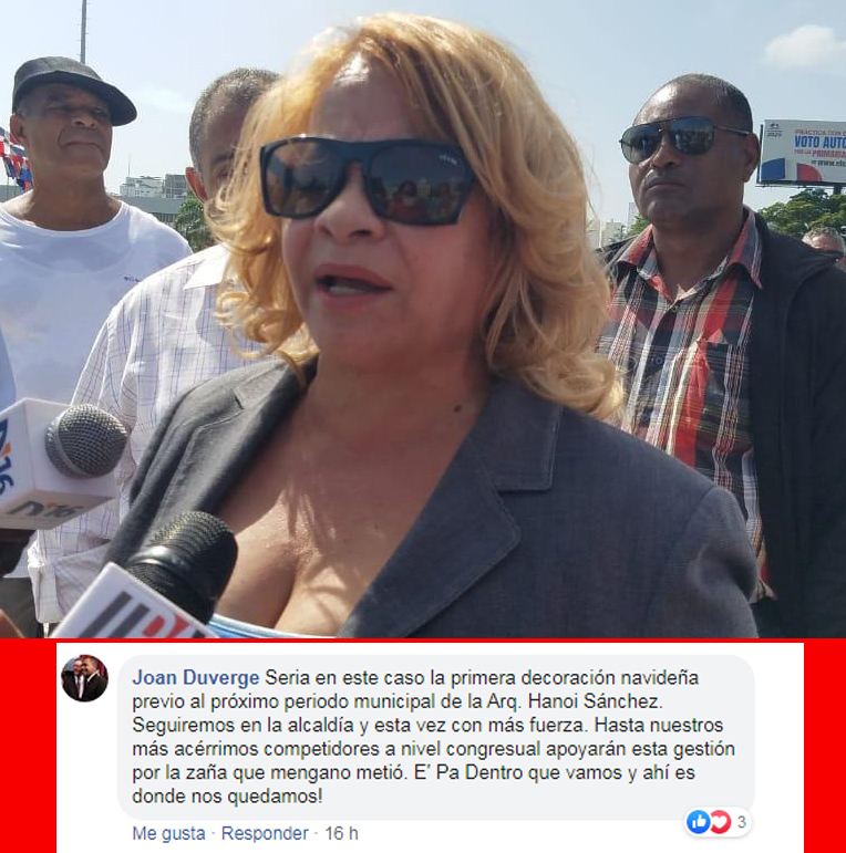 Lo que había dicho Joan Duverge asistente de la gallinita seria lo siguente: "Seria en este caso la primera decoración navideña previo al próximo periodo municipal de la Arq. Hanoi Sánchez. Seguiremos en la alcaldía y esta vez con más fuerza. Hasta nuestros más acérrimos competidores a nivel congresual apoyarán esta gestión por la zaña que mengano metió. E' Pa Dentro que vamos y ahí es donde nos quedamos!"