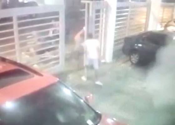 Un video grabado por la cámara de seguridad muestra que la mujer parqueba su vehículo cuando se percató de que los asaltantes habían ingresado armados al estacionamiento del edificio.