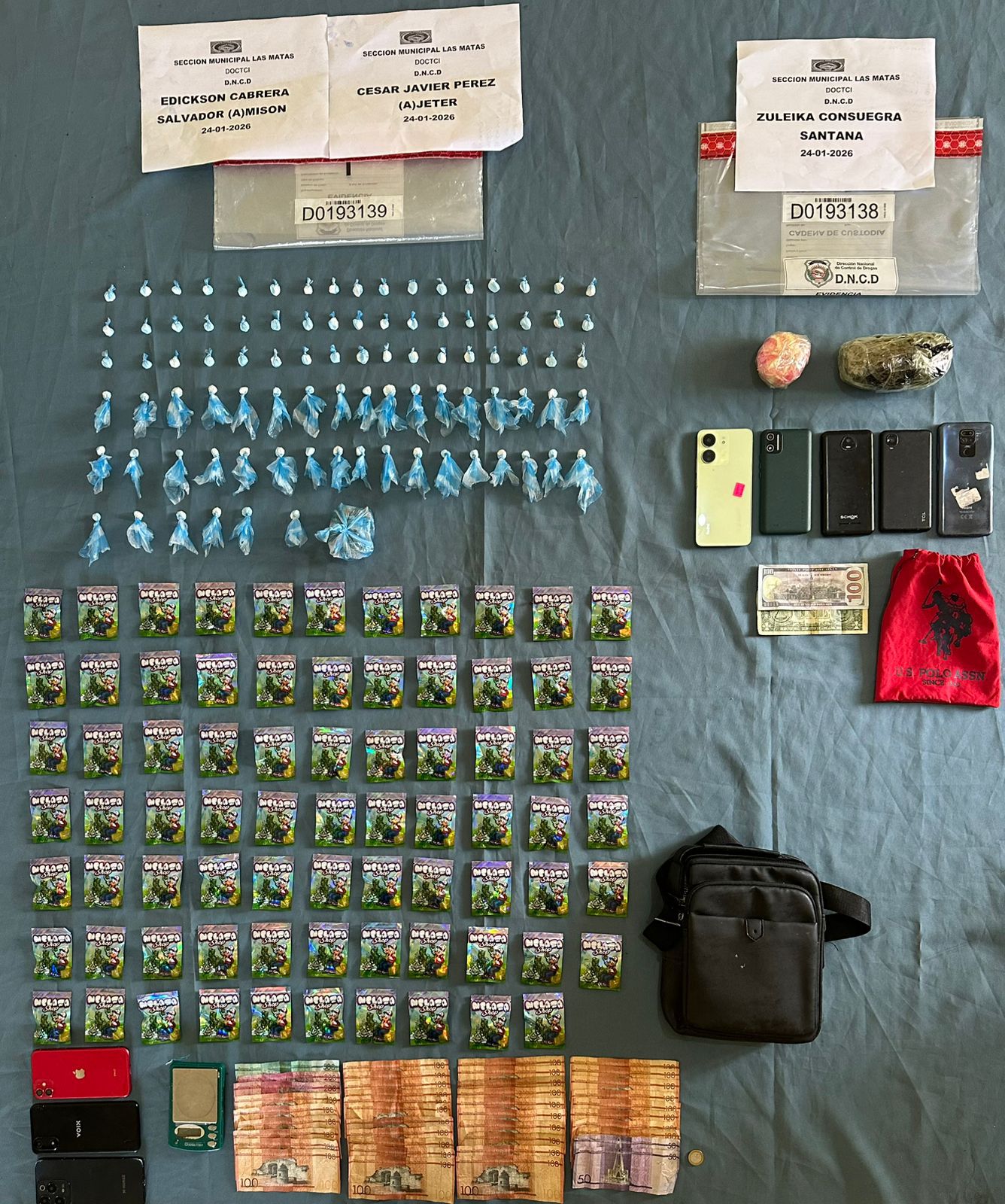 Las evidencias ocupadas incluyen 92 porciones de un polvo blanco, presumiblemente cocaína, con un peso aproximado de 239.1 gramos, y 78 porciones de un vegetal, presumiblemente marihuana, con un peso de 408.4 gramos, además de ocho celulares, una balanza, dinero en efectivo y un billete falso.