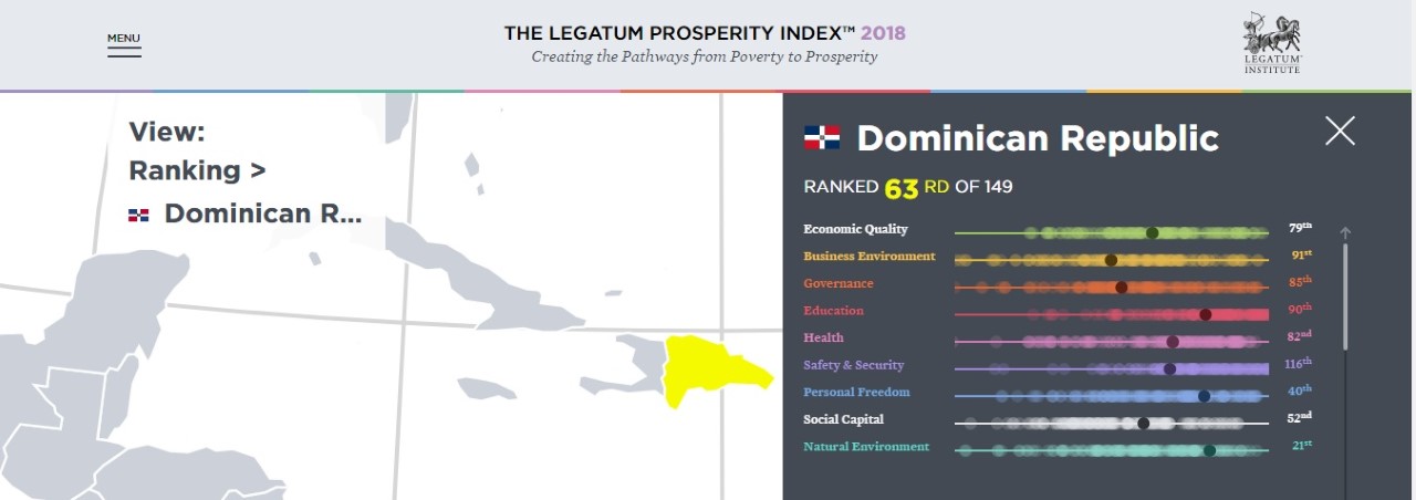 Santo Domingo, RD.- El informe del ranking Prosperity Index(Índice de Prosperidad) bajo la firma del Instituto Legatum, destaca que la República Dominicana ocupa el puesto #21 de 149 países en cuanto al cuidado y conservación del medioambiente, resaltando además, que el país es uno de los más eficientes del mundo alcanzando un score de 72.91 puntos, superando a países de Norteamérica como Estados Unidos que alcanza 72.26 puntos, a europeos como Bélgica que puntúa con un score de 72.83, a suramericanos como Chile que obtiene 70.81 puntos, a centroamericanos como Costa Rica con 69.85 puntos, así como a Portugal con 69.44 puntos, Japón 68.58 puntos y México 66.65 puntos.